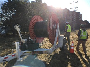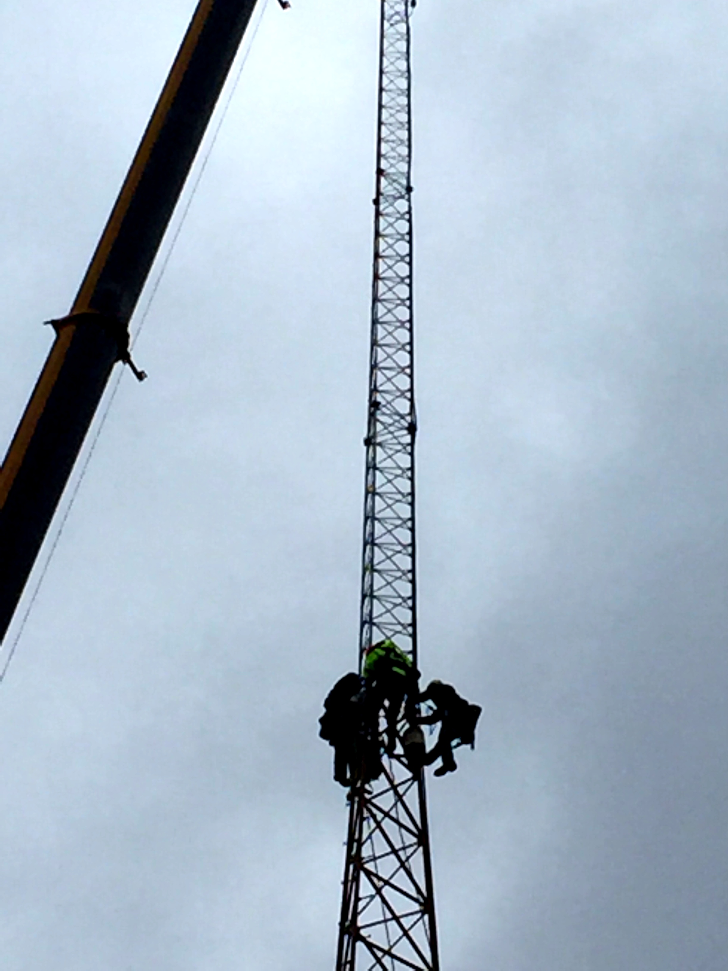 It is a long way up a 200' tower. Four men became ants when they reached the very top. An all terrain crane was rigged, and its telescoping boom was already 50' above the level of the tower. The winds were calm as the crew rigged the lifting slings and began to unbolt the top section.