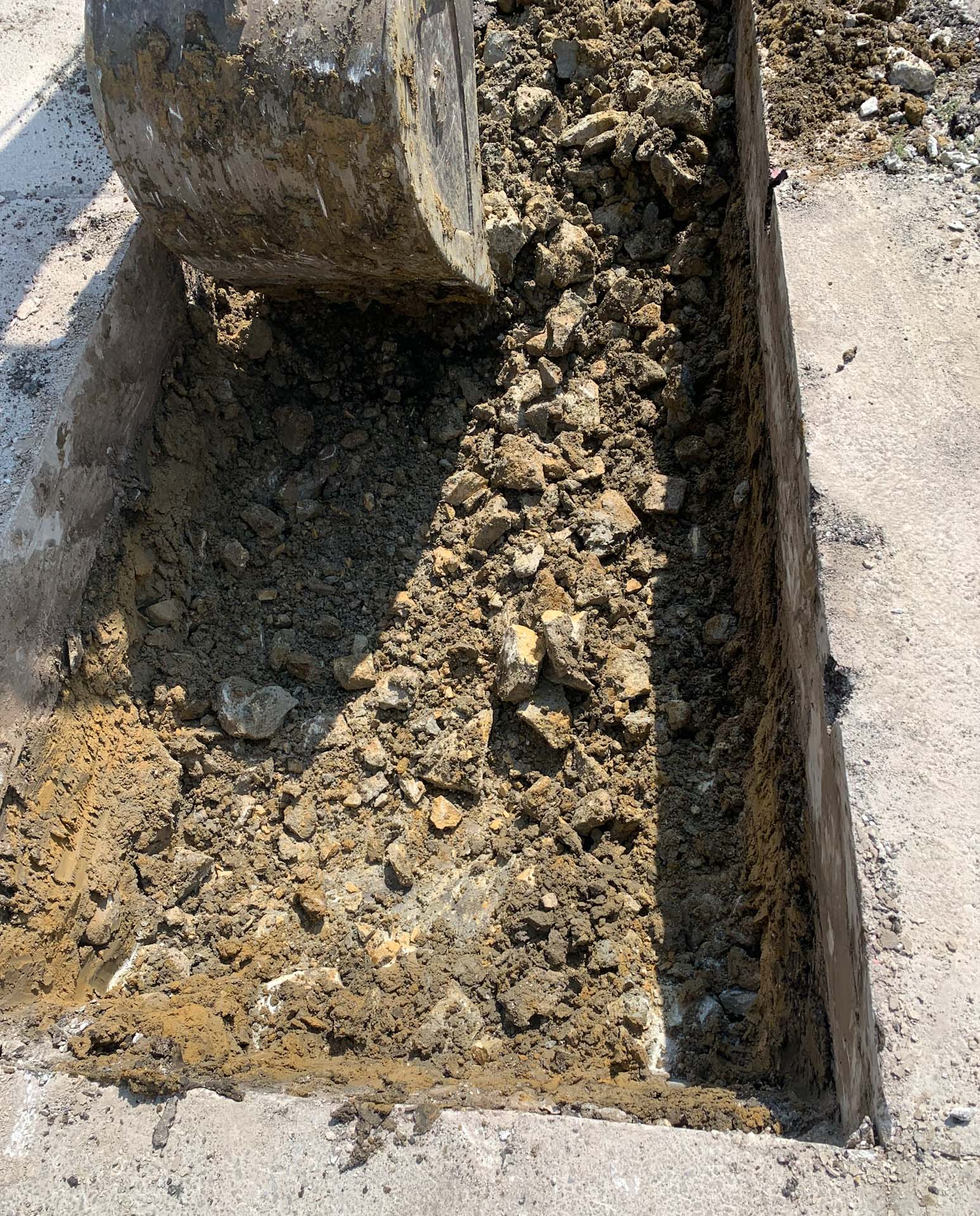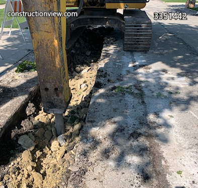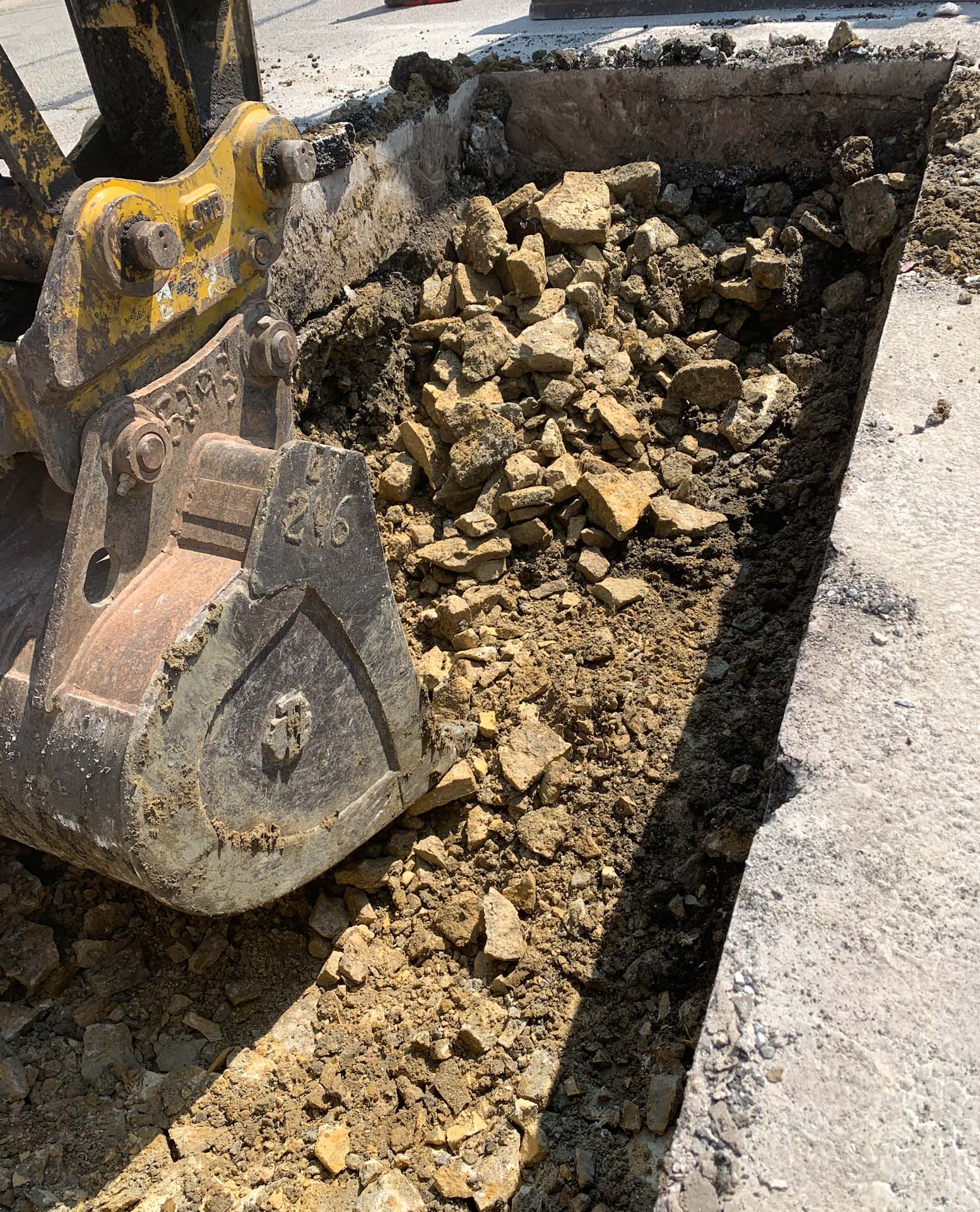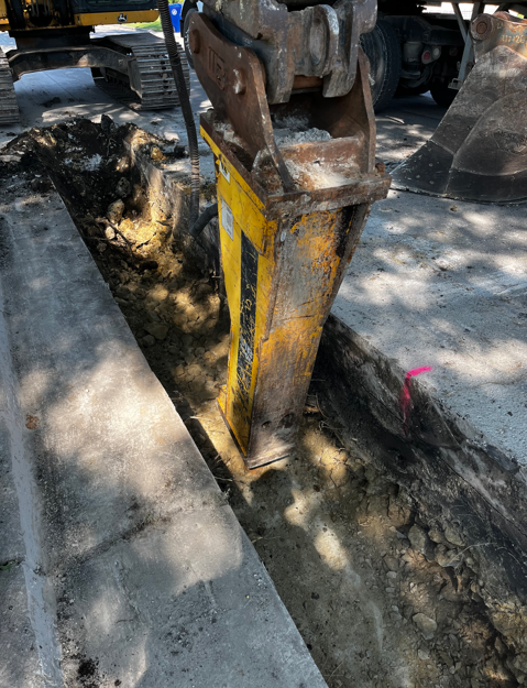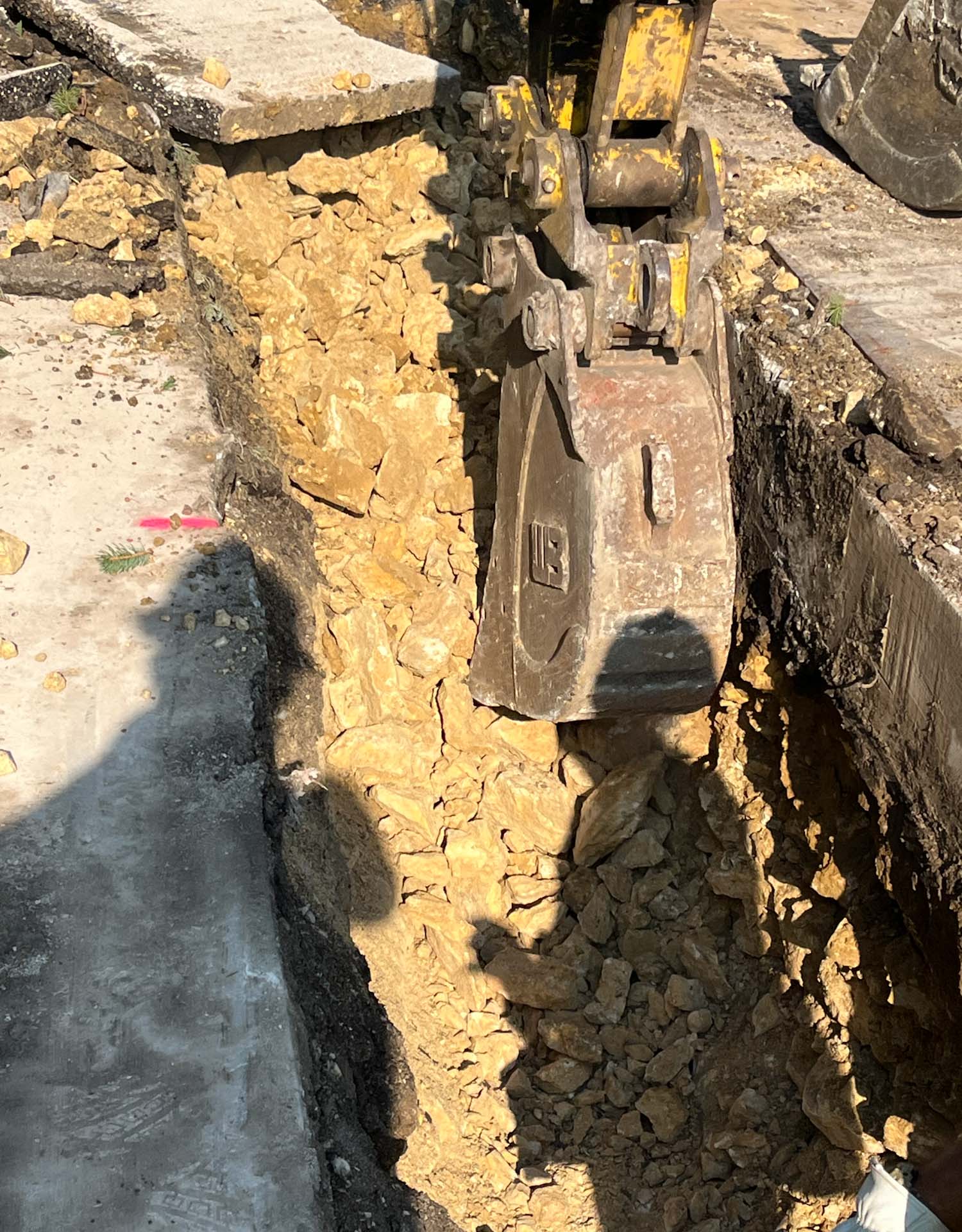 It turned out that ECC made the right decision to bring in a 120 series track hoe, and hydraulic breaker head. This machine was used to breakout and remove 1,200 feet of rock and achieve the desired depth for the open cut and burial of 1 – 6 inch PVC conduit. The trench edges were saw cut allowing the pavement and base paving to be broken out along a clean line. The rock can best be described as a layer of highly weathered limestone. Some of it was soft enough for a track hoe to dig through. However most of it required the breaker.