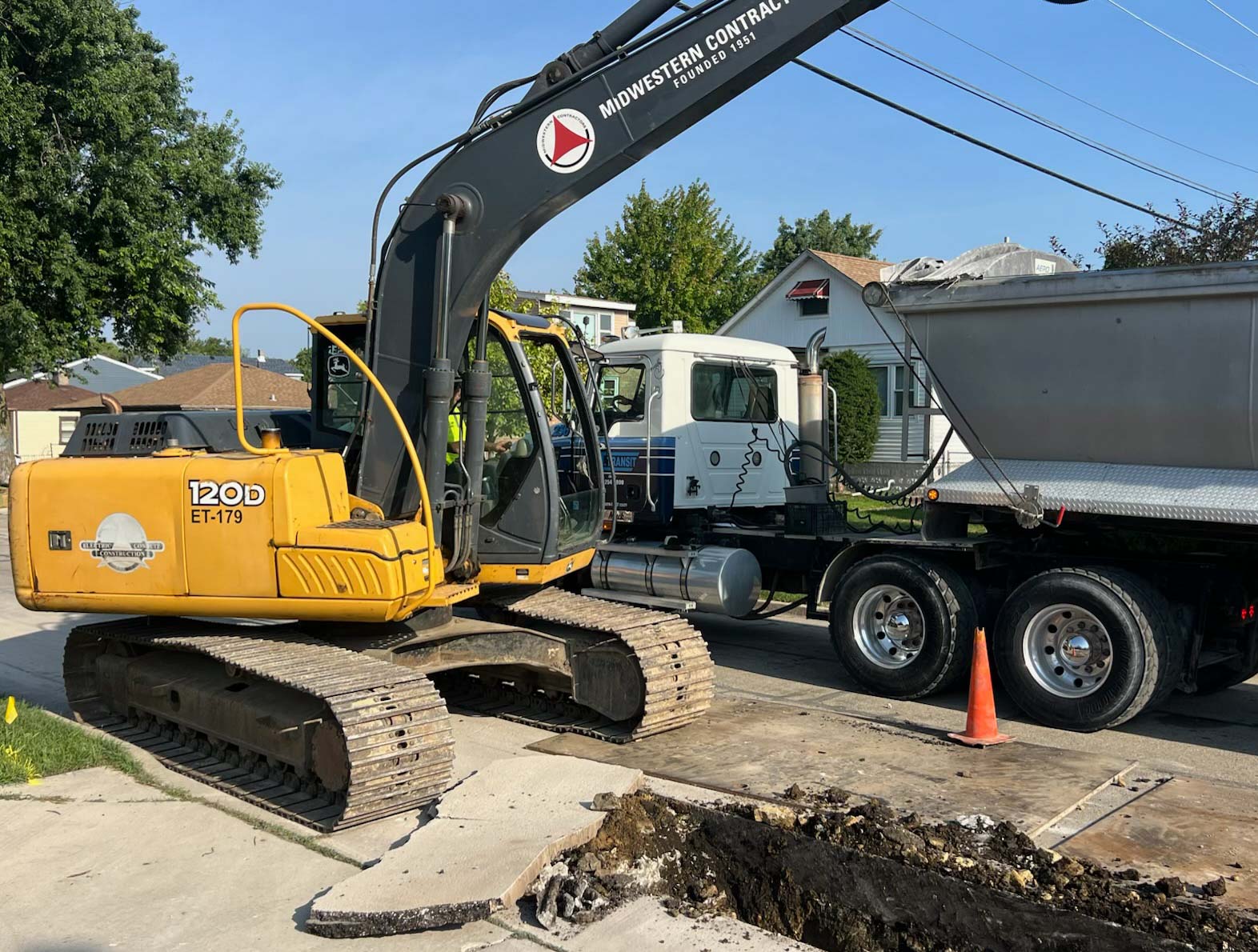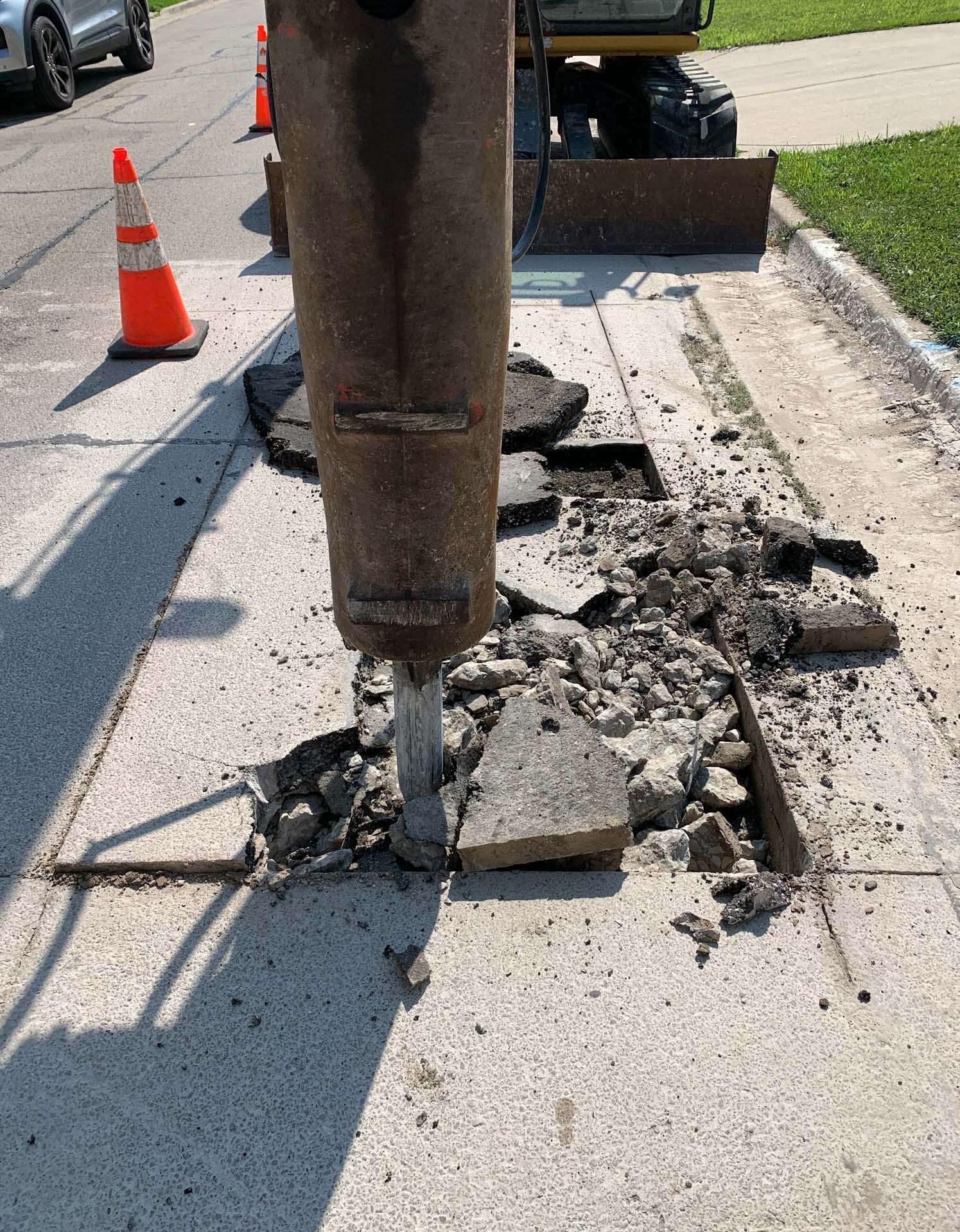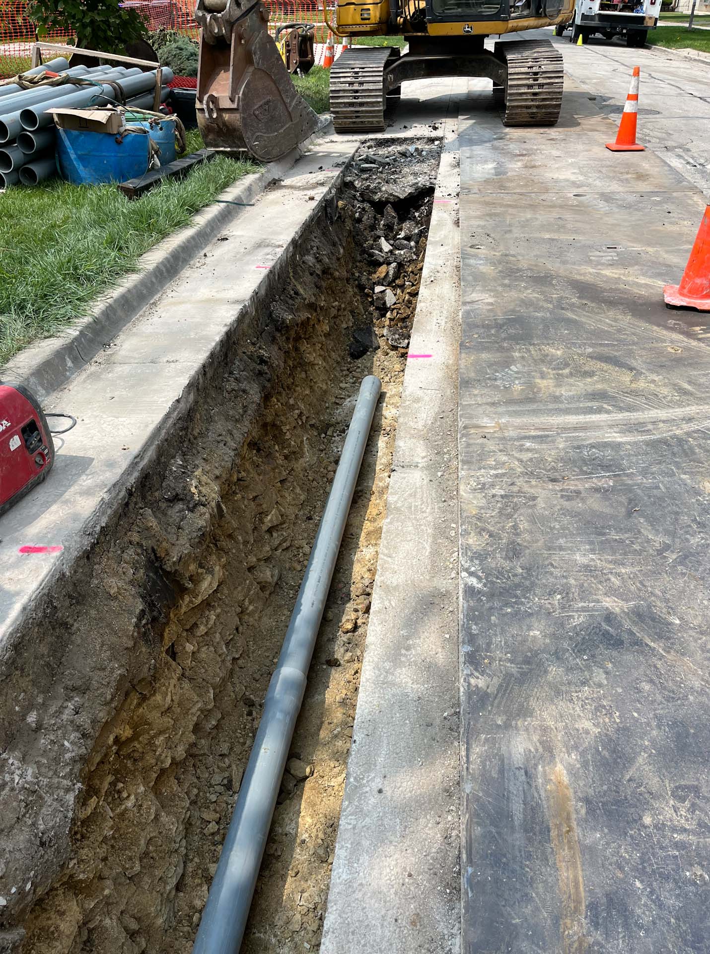 It turned out that ECC made the right decision to bring in a 120 series track hoe, and hydraulic breaker head. This machine was used to breakout and remove 1,200 feet of rock and achieve the desired depth for the open cut and burial of 1 – 6 inch PVC conduit. The trench edges were saw cut allowing the pavement and base paving to be broken out along a clean line. The rock can best be described as a layer of highly weathered limestone. Some of it was soft enough for a track hoe to dig through. However most of it required the breaker.